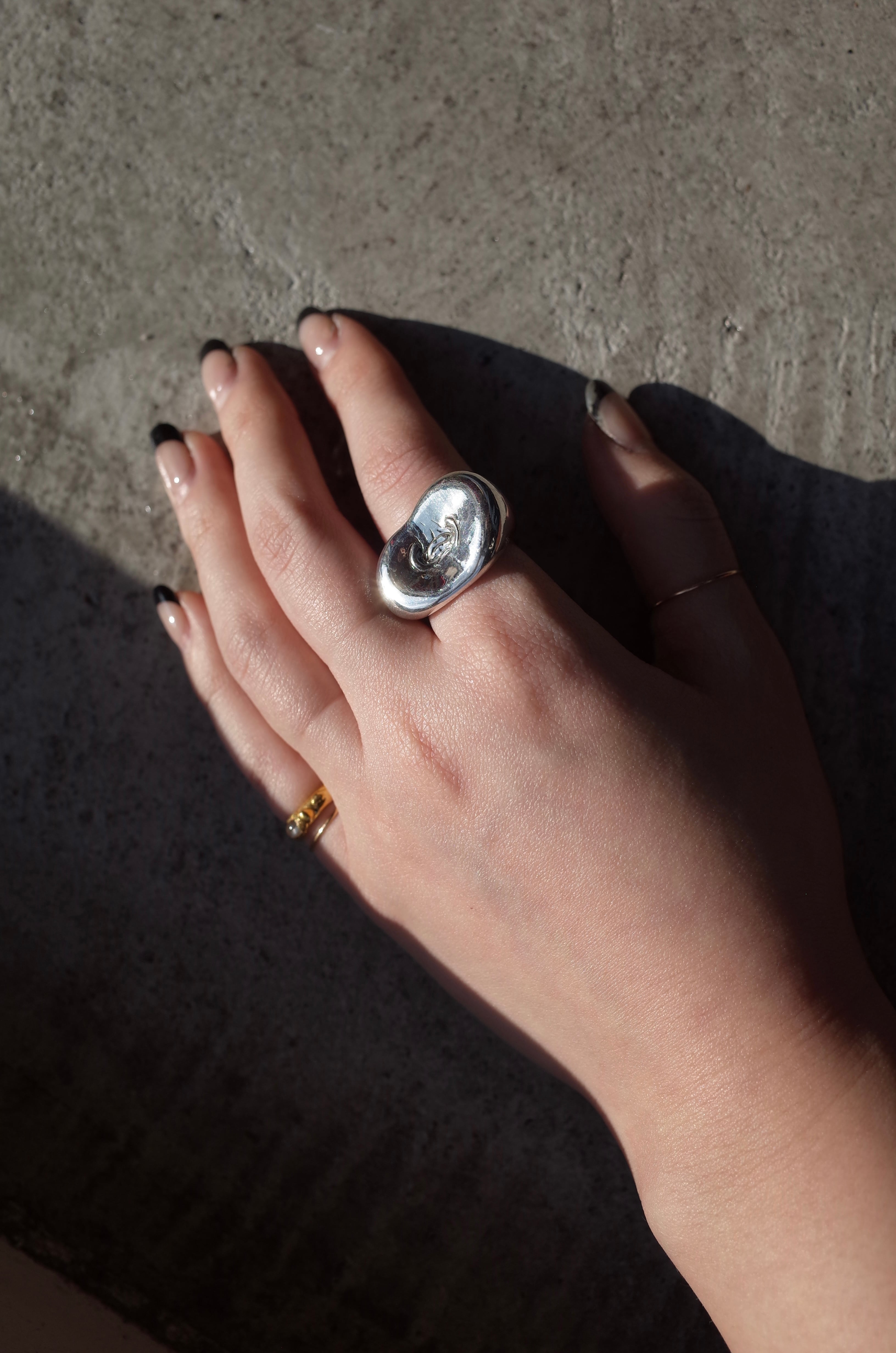 ボディパーツをテーマにした"nu"series nu とはフランス語で裸を意味します。 ユニークなデザインながらも、肌と馴染むジュエリーをお楽しみください。 nombril(へそ)を意味するリング。 大振りながらも指同士があたる部分を反って使っている為 着け心地が良いデザインになっています。 silver925/真鍮 9号